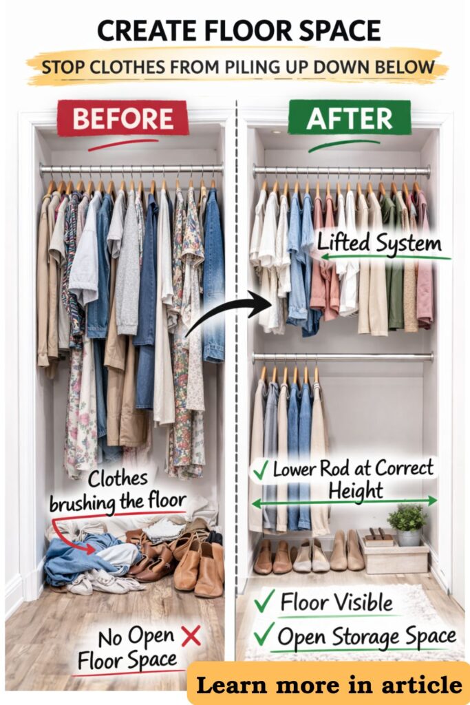 Remove every shoe and bag from the closet floor: Pull everything out so you can see the base of the closet clearly. This gives you a clean visual starting point instead of reorganizing around clutter.