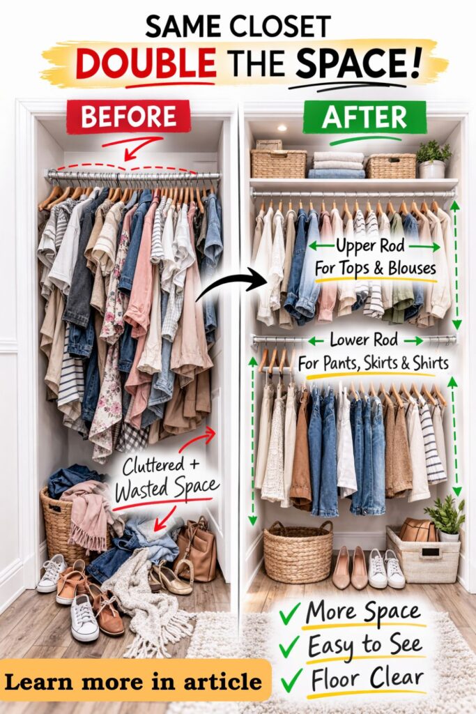 Convert only half the closet to double hanging: Install two rods on one side for short-hang items and leave the other side single-hang for dresses and coats.